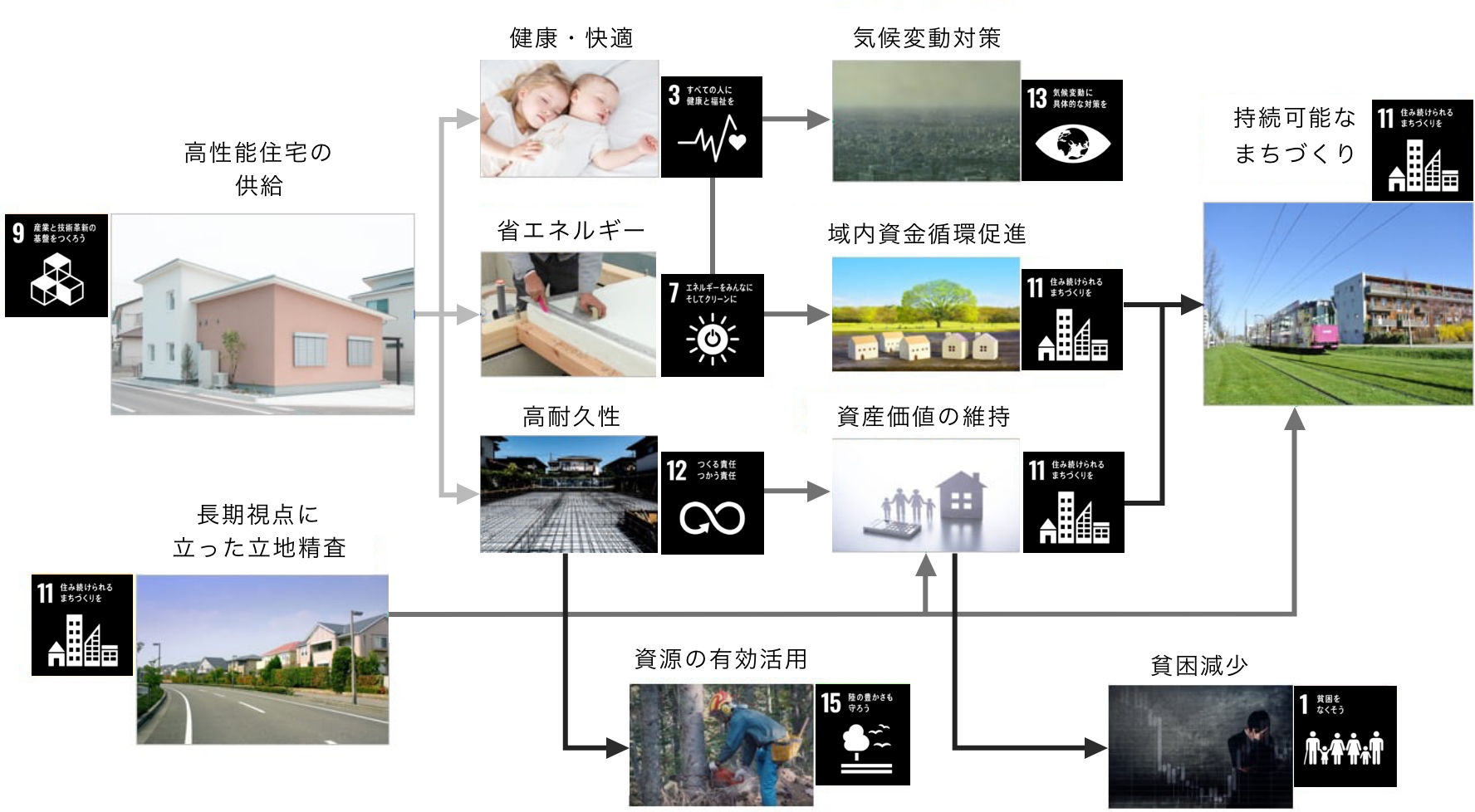 当社は、「未来の子どもたちのために、やがてこの子を守る家」というミッションのもと、持続可能な社会の実現に取り組んできました。健康・快適で、省エネルギー性能が高く、耐久性が高い高性能住宅の提供と、長期的な視点を持って住宅を建築する際の立地を精査することを通じて、CO₂を削減して気候変動を抑制するとともに、何世代にもわたって利用できる資産価値が維持される住宅の供給を通じて、資源の有効活用や持続可能なまちづくりにも貢献していきます。