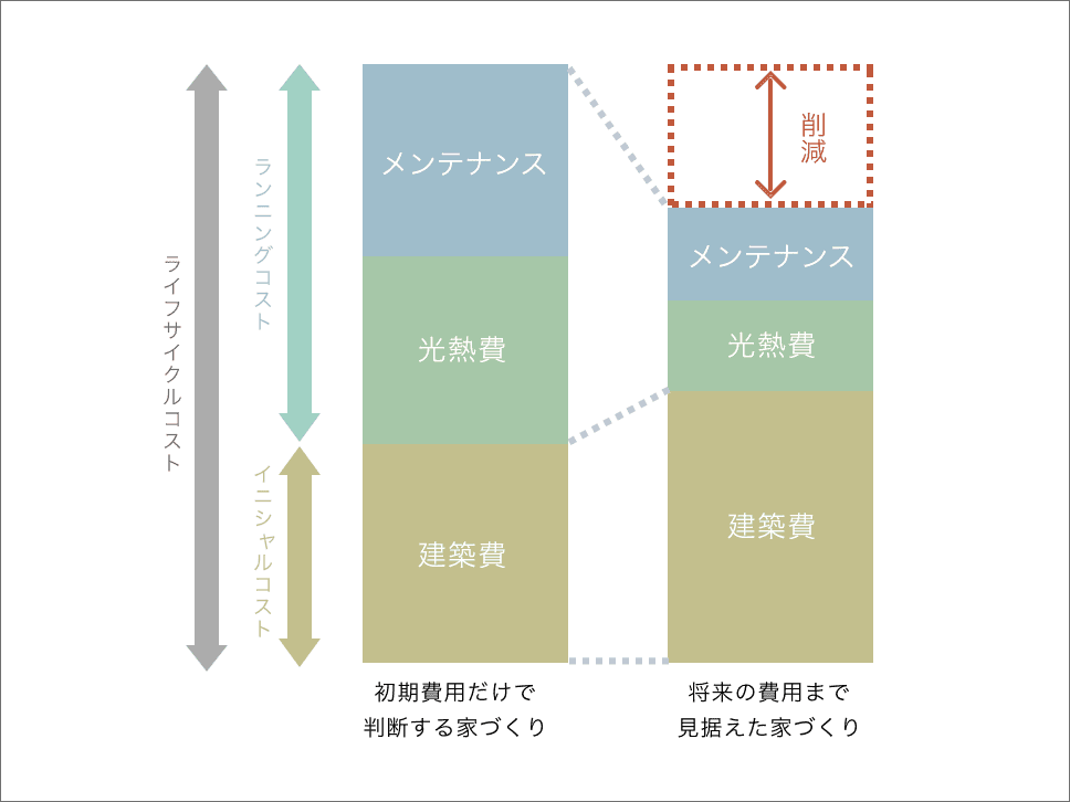 家づくりでは新築時の建築費だけに目が向きがちですが、それは全体の一部にすぎません。実際には、住み始めてから長くかかる費用まで含めて考えることが大切です。私たちは、この“建ててからの総費用”で住まいを捉える考え方を「ライフサイクルコスト(LCC)」と呼んでいます。