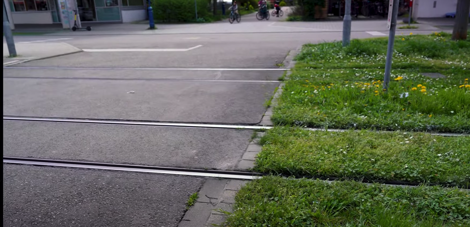 そこへ、ちょうどトラムが走ってきました。走行中の音はうるさいのですが、植物の部分に差し掛かると、驚いたことに、走行音が小さくなりました! 植物には音を吸収する効果があり、トラムの音を削減するために、ここでは緑の植物が敷き詰められているのですね。