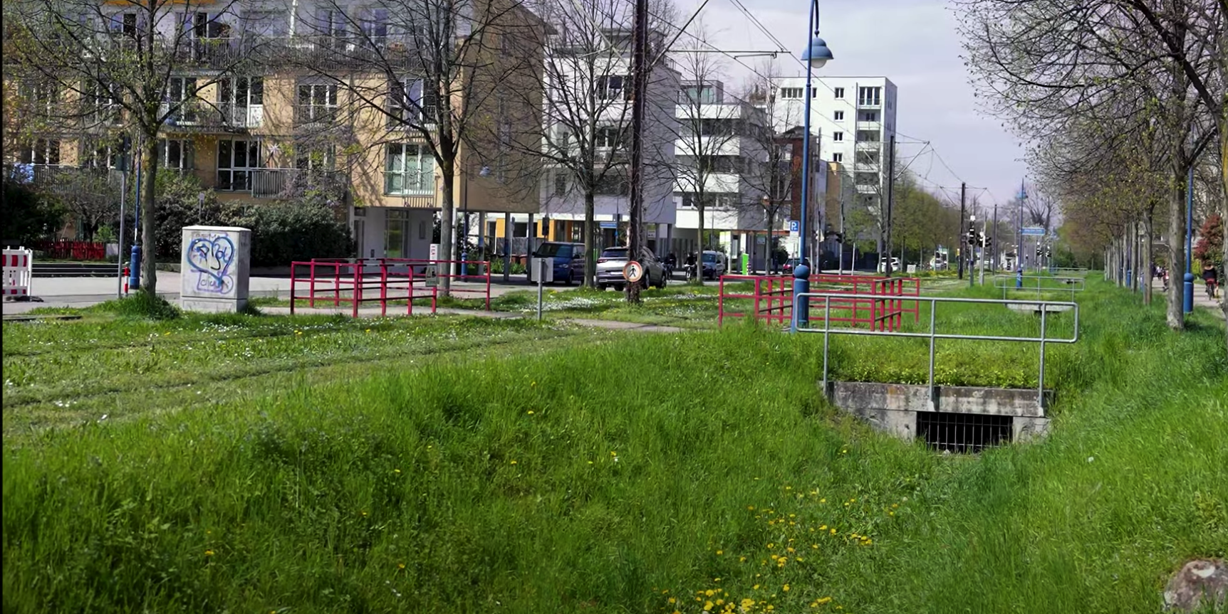 ヴォーバンでは、平日でも深夜1時頃まで、週末は朝までトラムが動いていますが、トラムが走るのは住宅地から50mも離れていないところです。そのため、音の対策として、このように植物を植えた線路がいたるところで利用されています。