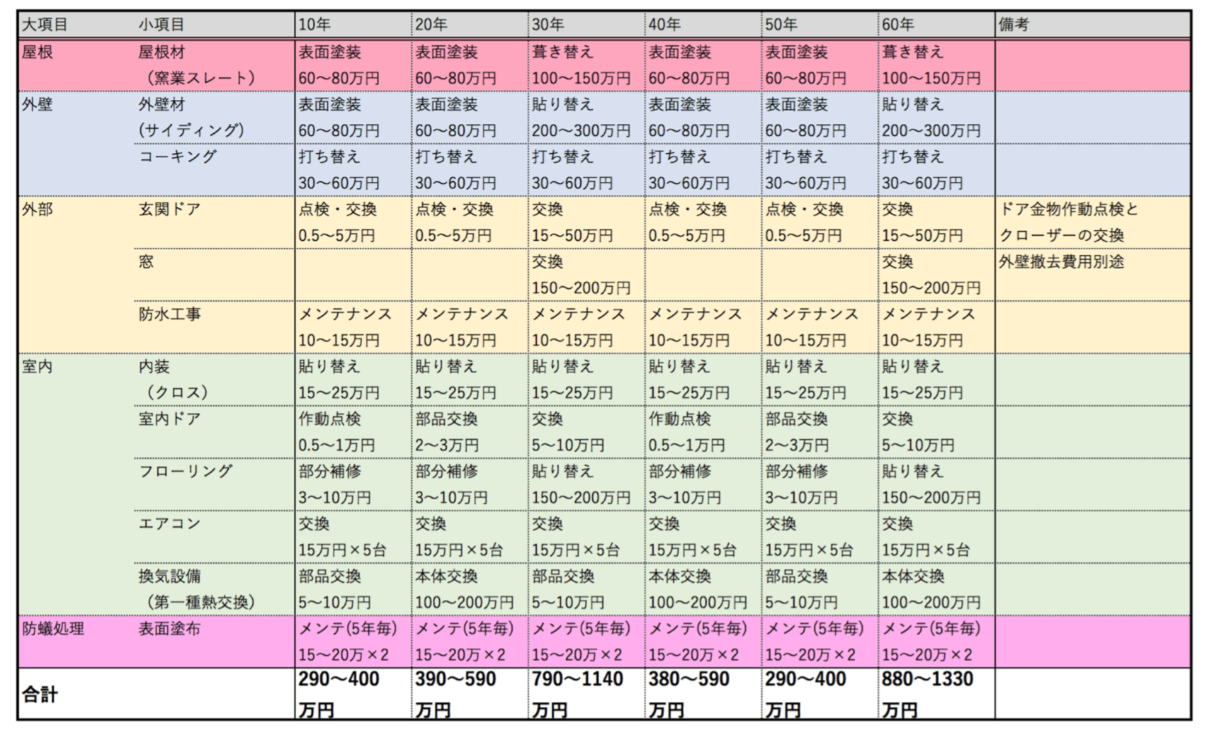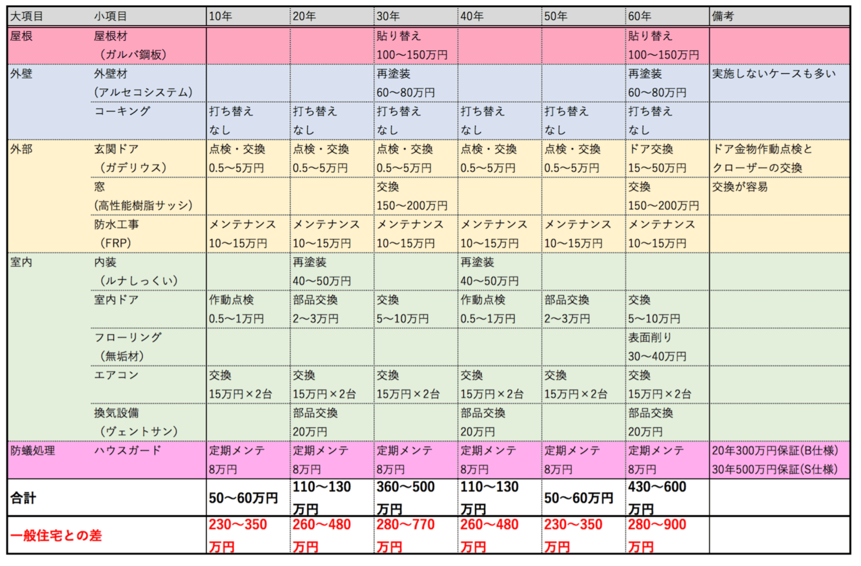 このようなメンテナンスを積み重ねると、60年間で3,000〜4,000万円のコストがかかります。