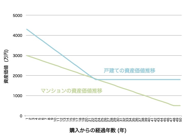 それでは、マンションと戸建ての資産価値の推移を比較してみましょう。マンションと戸建てを、以下のような価格で購入できるとします。