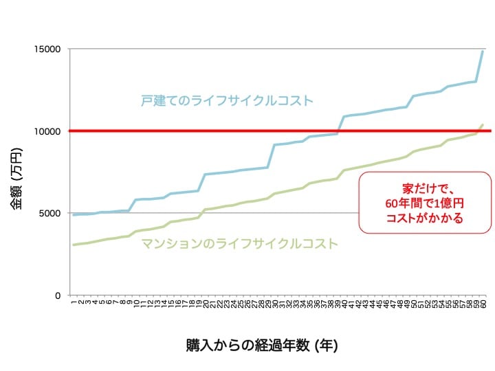 60年間にわたって払う必要のあるライフサイクルコストの累計は、1億円以上に及びます。