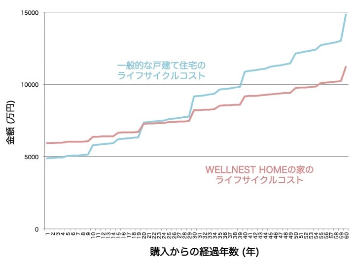 あくまでWELLNEST HOMEの場合ですが、60年間住み続けるとトータルで3,000〜4,000万円もライフサイクルコストが安くなります。
