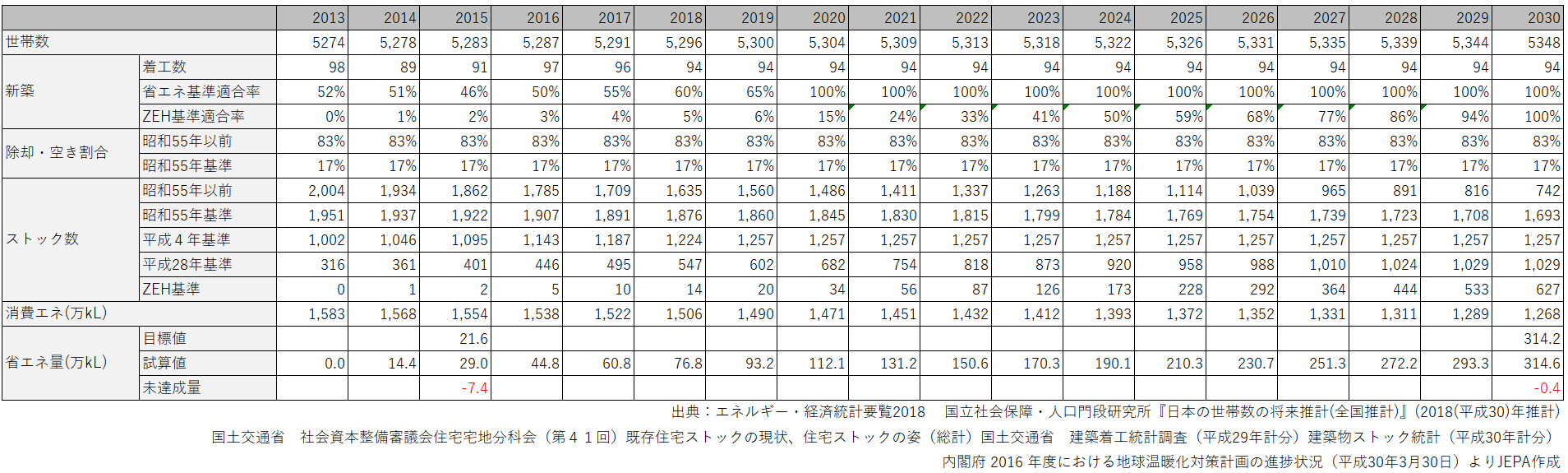 土台となる世帯数は最新の『日本の世帯数の将来推計(全国推計)』(2018(平成30)年推計)を使用します。内閣府の温暖化対策案でも、環境省の中期ロードマップでも、本資料を基に試算しています。2013年の同資料は5年スパンで作成されるため、2013年の世帯数がありませんが、2010年と2015年の値差を年数案分して2013年を5,274万世帯として、試算します。