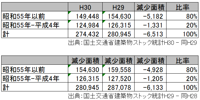 平成30年と平成29年を比較してみると昭和55年以前が80%、昭和55年~平成4年が20%、一年さかのぼって平成29年と平成28年を比較しても同じく昭和55年以前が80%、昭和55年~平成4年が20%となりました。