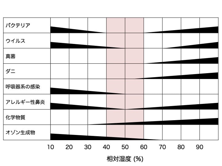 諸々の健康リスクと相対湿度の関係を考えると、最適な相対湿度としては40〜60%の範囲になります。