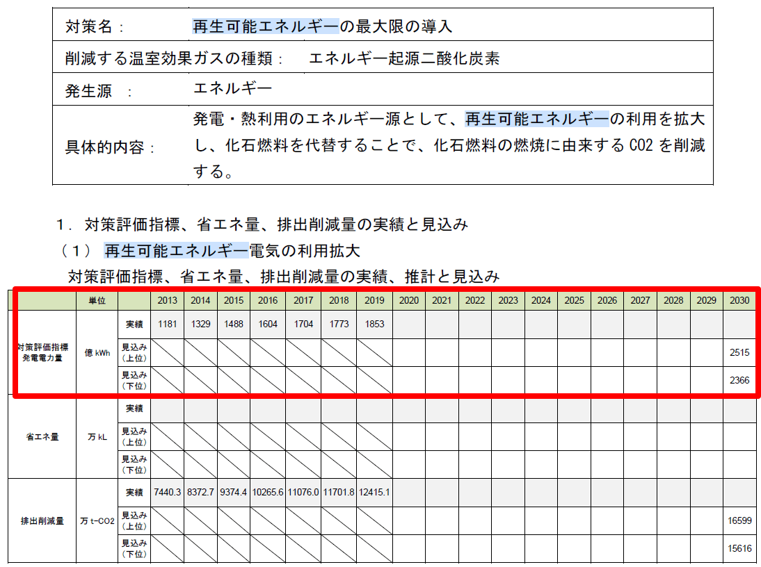 ※注意書きで原油換算5.94万kLは再エネとダブルカウントとなるため、再エネ効果分として除外している。確かに、温暖化対策計画では、「再生可能エネルギーの最大限の導入」と言う対策名で「(1) 再生可能エネルギー電気の利用拡大」という項目があります。「2019 年度における地球温暖化対策計画の進捗状況」のP265に本対策の成果指標として、「発電電力量」が「発電電力量総合エネルギー統計(2019 年度速報値)より」とありますので、両資料を確認してみました。