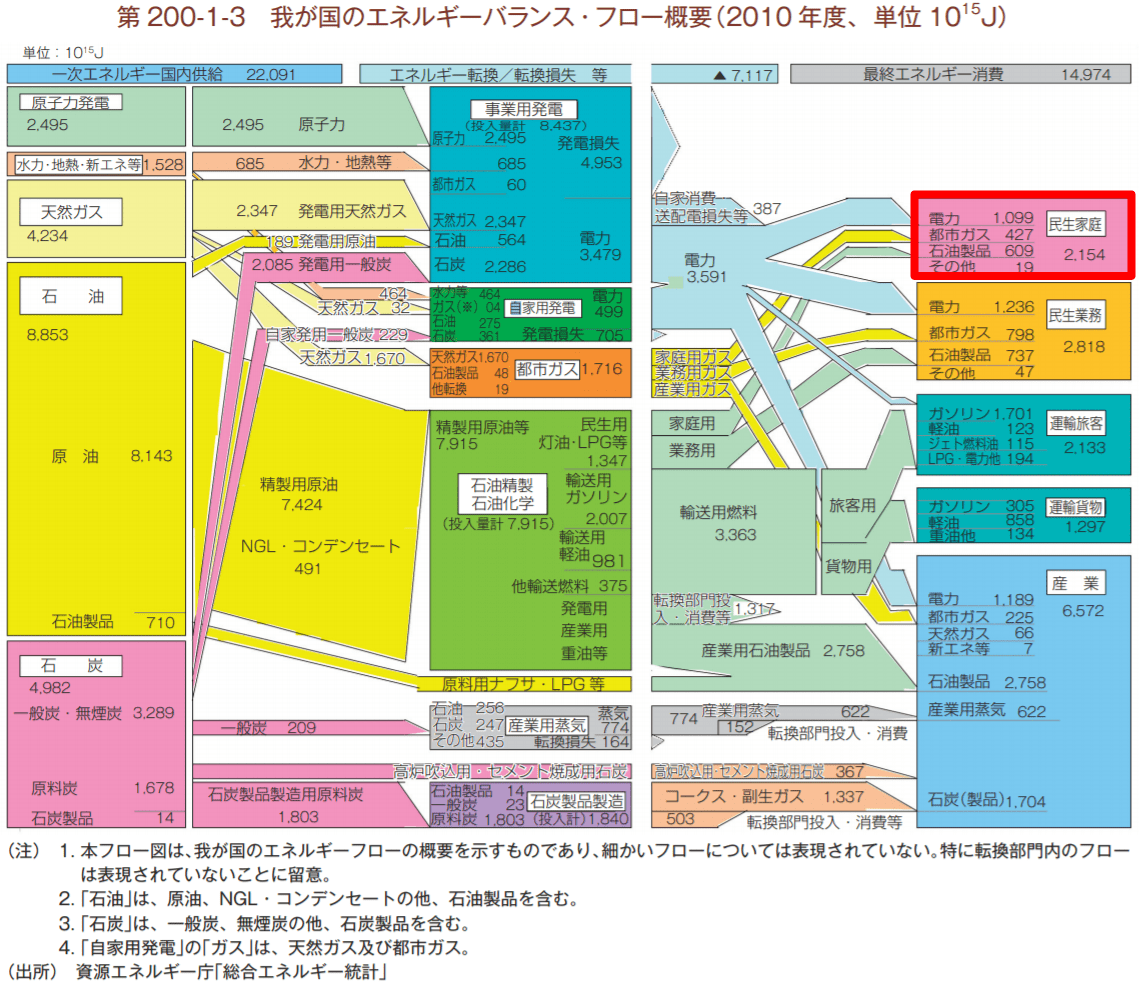 因みに、上記の試算による家庭全体の一次エネルギー消費量5,153PJ/年は、2012年エネルギー白書における家庭全体の一次エネルギー消費量4,033PJ/年と大きな乖離を示しているのですが、資料にも注意書きで以下のように記載がありました。