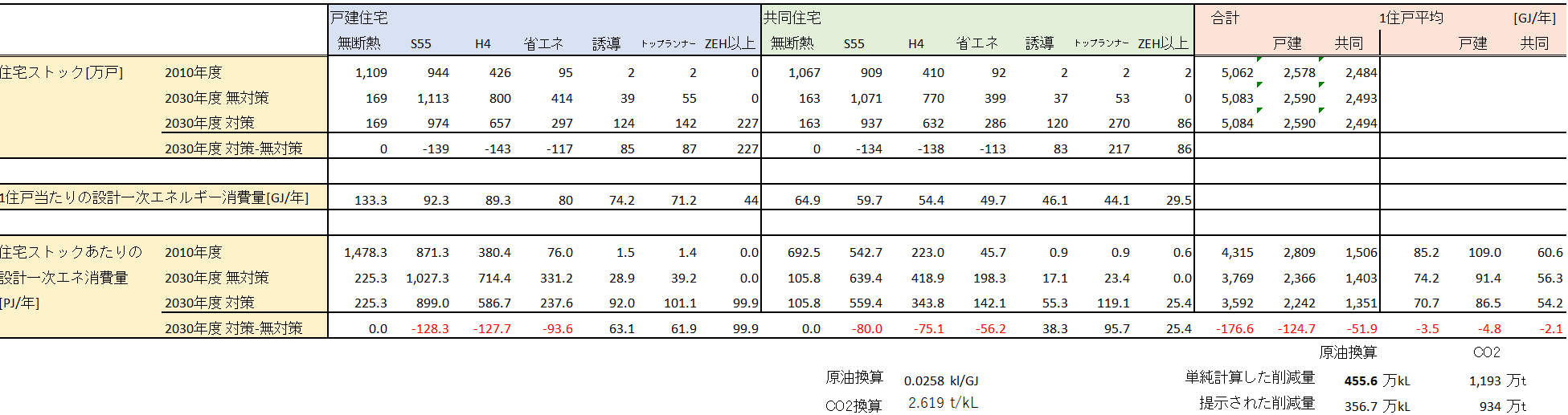 2010年の全体の住宅全体の一次エネルギー消費量が5,153PJ、2030年の温暖化対策による削減量は-一次エネ250.2PJ=原油換算645.4万kL=CO2削減量1,690.3万tとなりました。日本の2010年のCO2排出量が14億8千万tなので、1.1%の削減となる政策となります。