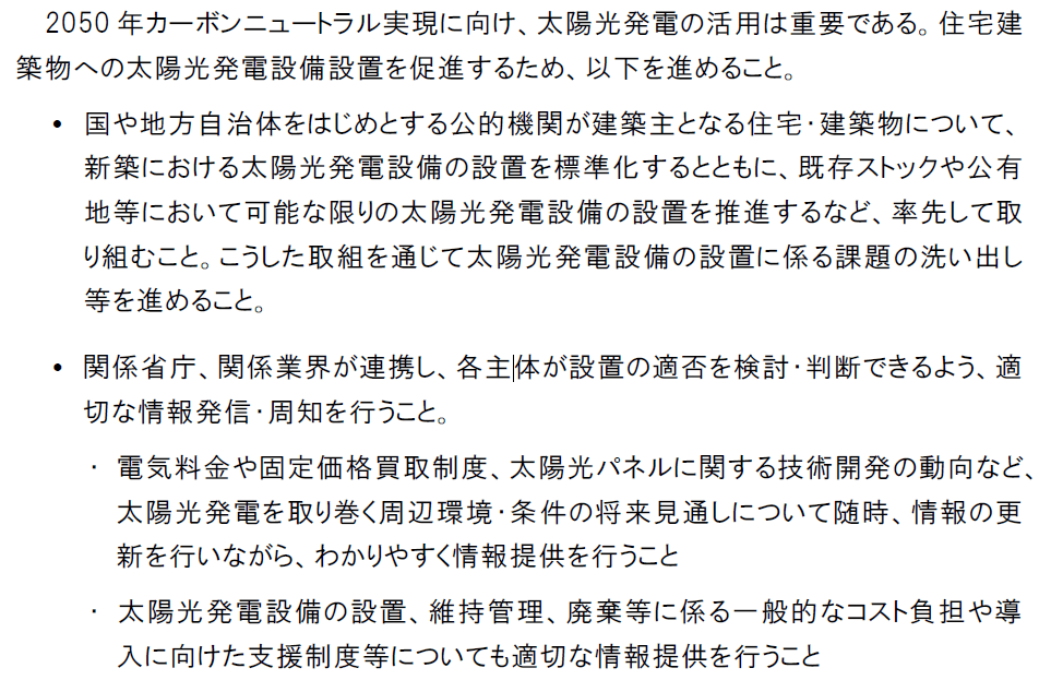 冒頭にカーボンニュートラルには太陽光発電の活用が重要であると記載されています。2018年試算では、削減量の半数以上を太陽光発電でたたき出しているのだから当然の表現と思います。以下の内容も検討会の疑似に沿った内容となっており全て必要かと思います。
