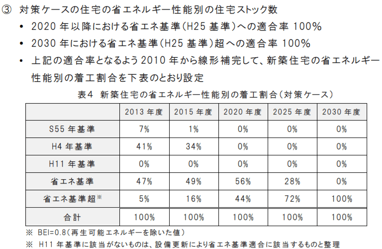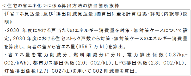 なお、上記の2の誘導政策の場合、給湯や・照明・空調の高効率化(所管は経済産業省)と削減量が重複してしまうため、「高効率給湯器の導入」「高効率照明の導入」「トップランナー制度などによる機器の省エネ性能向上からは、「新築省エネ基準の推進分」を控除する形で、削減量のダブルカウントを回避している形になっていました。