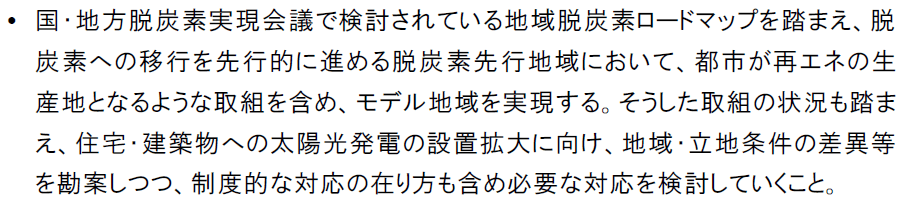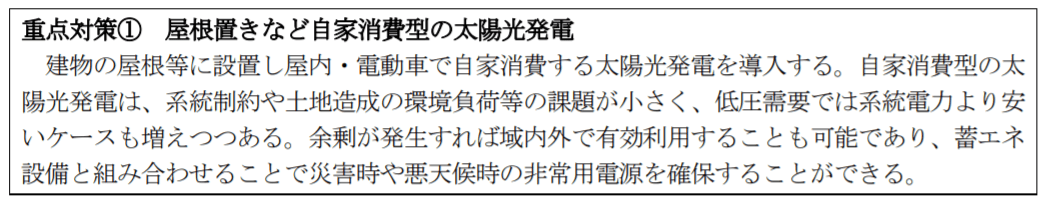 直近の6月9日の内閣府で開催されている「国・地方脱炭素実現会議」でまとめられている「地域脱炭素ロードマップ(案)」の重点政策の一丁目一番地に屋根置き太陽光発電とあります。