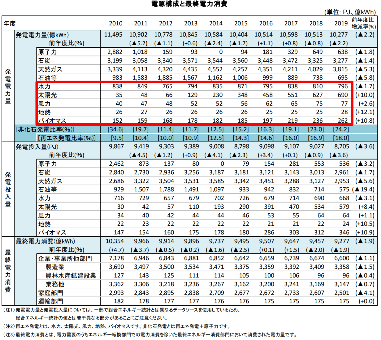 情報ソースの発電電力量(対策評価指標)総合エネルギー統計(2019 年度速報値)のP4に発電電力量が記載されており、各年次の数字は上段にありました。