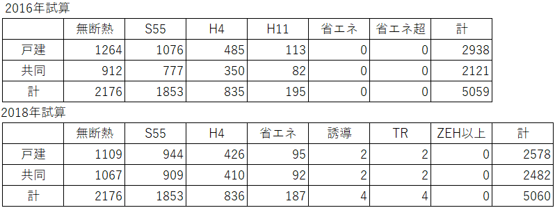 見比べるためにエクセルで整理してみました。以下を見る限り、各グレードごとの総数は変えていないようで、約5060万戸で割り振りをし直したという事なのでしょうか。2016年試算は戸建てと共同住宅の戸数の振り分けがかなり間違えていたと解釈すべきなのかもしれませんね。