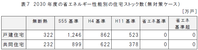 続いて評価の前提条件として2010年どの住宅ストック数がこちら。ここから2030年、つまり20年後の各グレードのストック数がどのように変化していくかで、無対策ケースと対策ケースの戸数変化を成果量としてカウントしていく方式になっています。