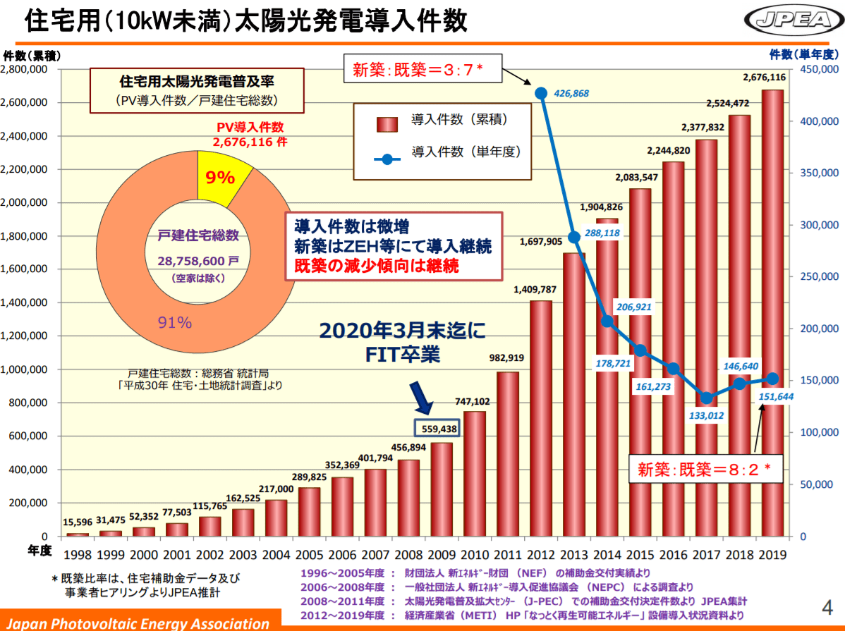 P4に住宅用(10kW未満)の導入件数の推移という表があります。ここから2012年~2019年までの累積導入量を概算で導き出すと、約169万件となります。同5PにはFIT累積導入量は691.3万kWとありますので、約4.08kW/件となります。