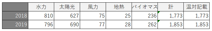 上記の水力~バイオマスまでの数字を合計していくと以下の通りとなりました。