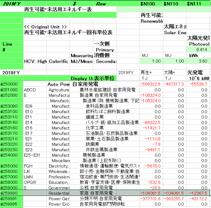 さて、具体的に検証してみます。発電電力量(対策評価指標)総合エネルギー統計(2019 年度速報値)の詳細内容につきましては、総合エネルギー統計(エネルギーバランス表)に各項目の詳細な値が掲載されておりまして、住宅の太陽光発電に関しては固有単位表内の「自家用発電」カテゴリー内に「#259990 家庭 自家用発電」として約124億kWhの発電量が計上されていました。