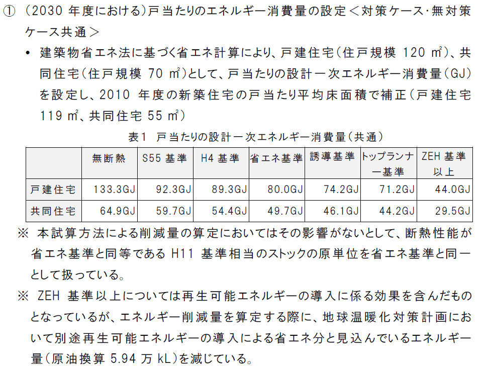 おっと・・・断熱グレードの分け方が激変してますね。特に前回は「省エネ基準超BEI=0.8」1つだった高性能カテゴリーが3つに増えてます。この2年間で一体何があったのでしょうか?特に大きな変化はなかったように思いますが・・・。もう一つ、決定的に異なるのが、以下の2つめの※以下です。 ZEH 基準以上については再生可能エネルギーの導入に係る効果を含んだものとなっているが、エネルギー削減量を算定する際に、地球温暖化対策計画において別途再生可能エネルギーの導入による省エネ分と見込んでいるエネルギー量(原油換算5.94 万kL)を減じている。 前回までの削減案には太陽光発電は除外した削減量であることが明記されていました。ところが今回からは太陽光発電自家消費分は含めて計算することになっています。これは評価方法の考え方からして至極当然の結果ではあるので、歓迎すべき変更と思います。国土交通省もついに再エネに見ざめたか!!むしろこれまでの頑なに再エネは自分たちの所管ではないとする姿勢がおかしかったと考えます。太陽光発電の自家消費分は宅内で完結する為(系統側から見ると省エネと同意義)再エネと言うよりは省エネと考えるのが妥当なので。