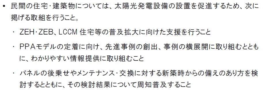 2点目の記述によって主力としてPPAモデルの定着に期待を寄せている事がうかがえます。(PPAモデル(自家消費型第三者所有モデル)とは、施主はPPA事業者に屋根を貸す代わりに約10年間程度の期間はPPA事業者と電力需給契約を締結することで、初期費用0円又は非常に安価に太陽光発電を導入できるモデルのことで、一般的には10年後には太陽光発電は施主に無償譲渡される形式が一般的)