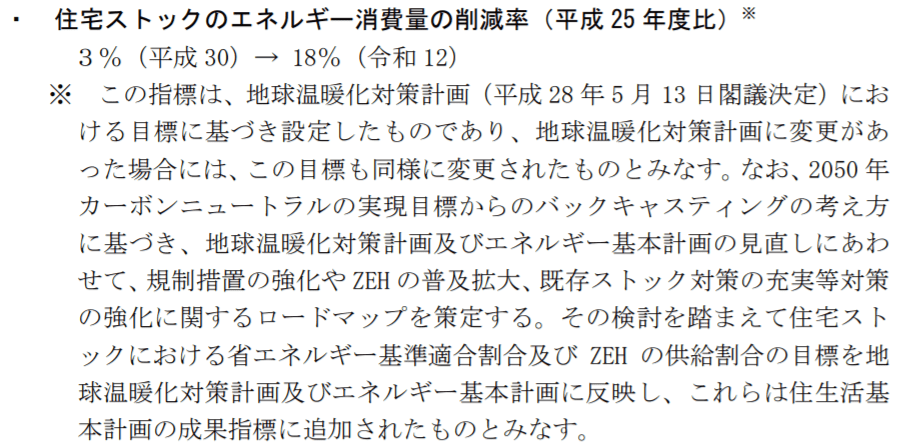東京大学大学院の前正之准教授による、住宅のさらなる高性能化についての提言を始めとする再エネタスクフォース会議(以下再エネTF会議)での議論を受け、住生活基本計画に2050年カーボンニュートラルに向けた記述が盛り込まれた様です。特に成果指標の注意書きに、以下の記述が入ったのが非常に大きいです。