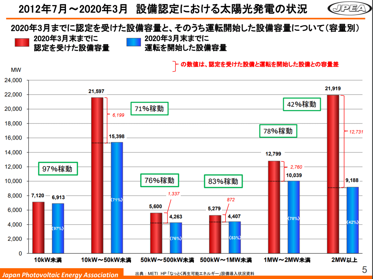 124億kWh/年を太陽光発電累積導入量の268万件で割ると、平均4627kWh/年という値が出て来ます。この4627kWh/年を平均kW当り発電量(平均設備利用率13.8%=8760*13.8%=1209kWh)で割ると、約3.8kW/件となりました。
