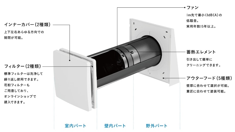 また、オプションでダクト式換気システムを選択することも可能です。これは外気の取り込み口が1カ所しかないため、音や有害物質の侵入を限りなく抑えることができ、交通量の多いエリアなど、音や空気の質が気になる環境にも適しています。さらに、給気ダクトの入り口に電子式集塵フィルタを取り付けることも可能。静電気の原理を応用したフィルタが、大きな粒子からウイルスサイズの微粒子まで吸着します。フィルタは汚れても目詰まりしにくいため換気量は変わらず、メンテナンス直前まで集塵能力が変わらないのが特徴です。