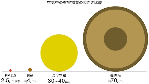 花粉はとても小さく、スギ花粉でおよそ30〜40μm(0.03~0.04mm)。人の髪の毛と比べると、その半分ほどの大きさしかありません。さらに、黄砂やPM2.5は花粉よりも小さな粒子です。これほど小さな粒子では、マスクやメガネだけで完全に防ぐことはできません。