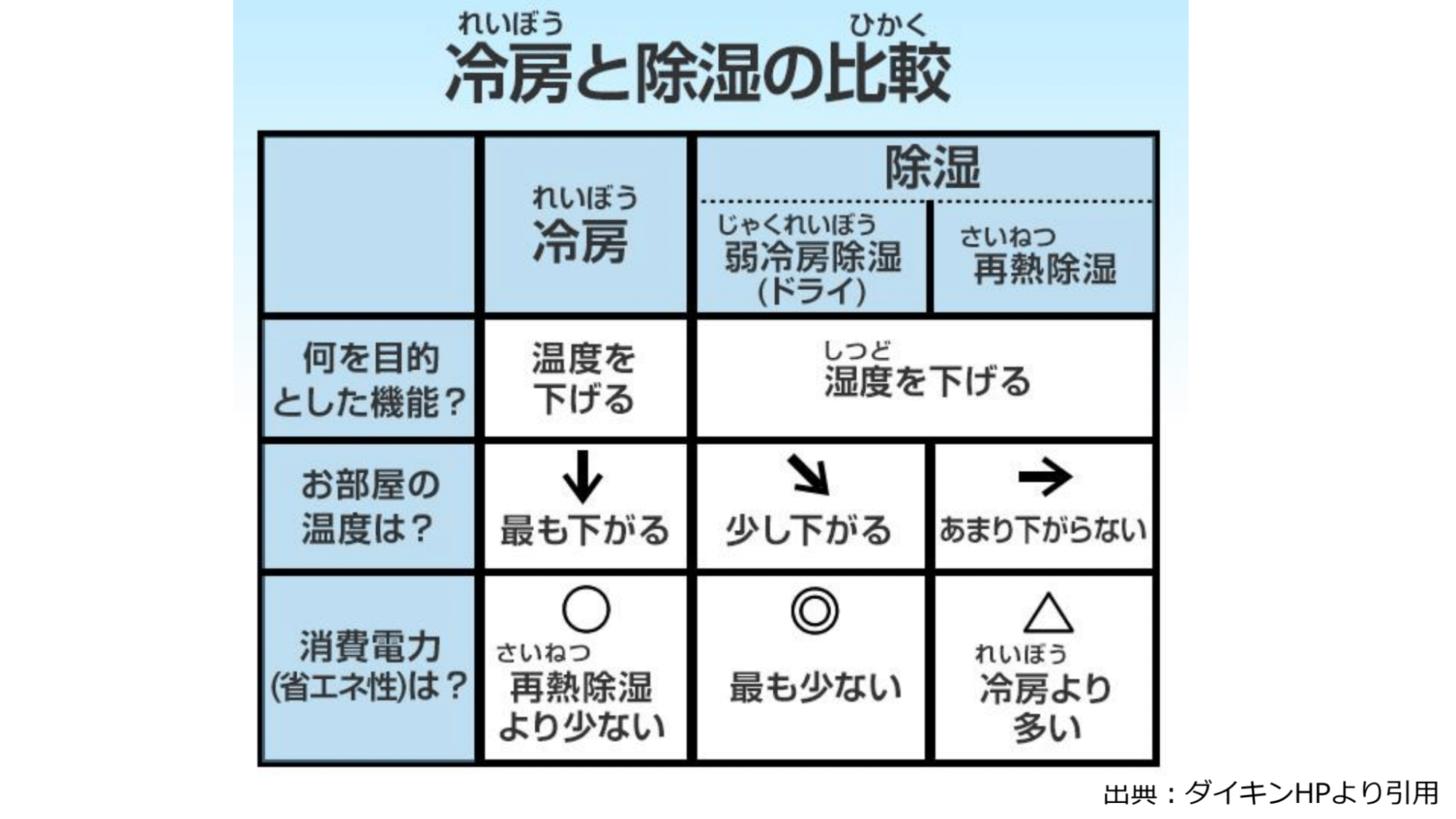 こちらの「冷房と除湿の比較」に関する表をご覧ください。 目的、温度、消費電力にはこのような違いがありますね。