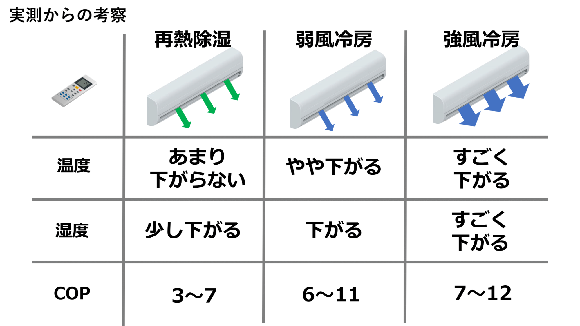 弱風冷房は、温度と湿度を緩やかに下げます。 また、再熱除湿より除湿能力が高いです。 ちなみに、弱風冷房で温度を下げて(16°C程度)運転すると、温度を保ちながら湿度を大幅に下げることができます。 消費電力も少ないので、湿度のみ下げたい場合はおすすめですよ!