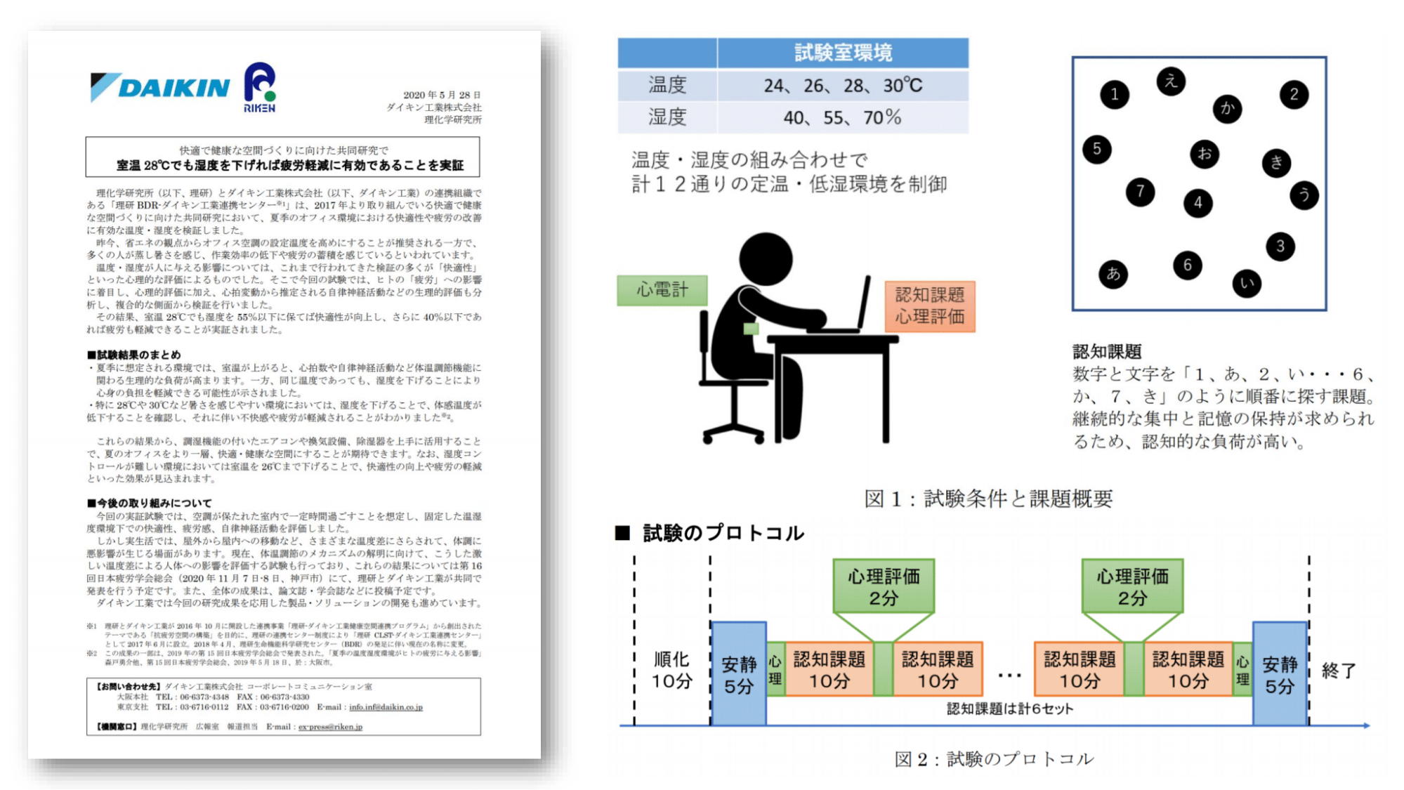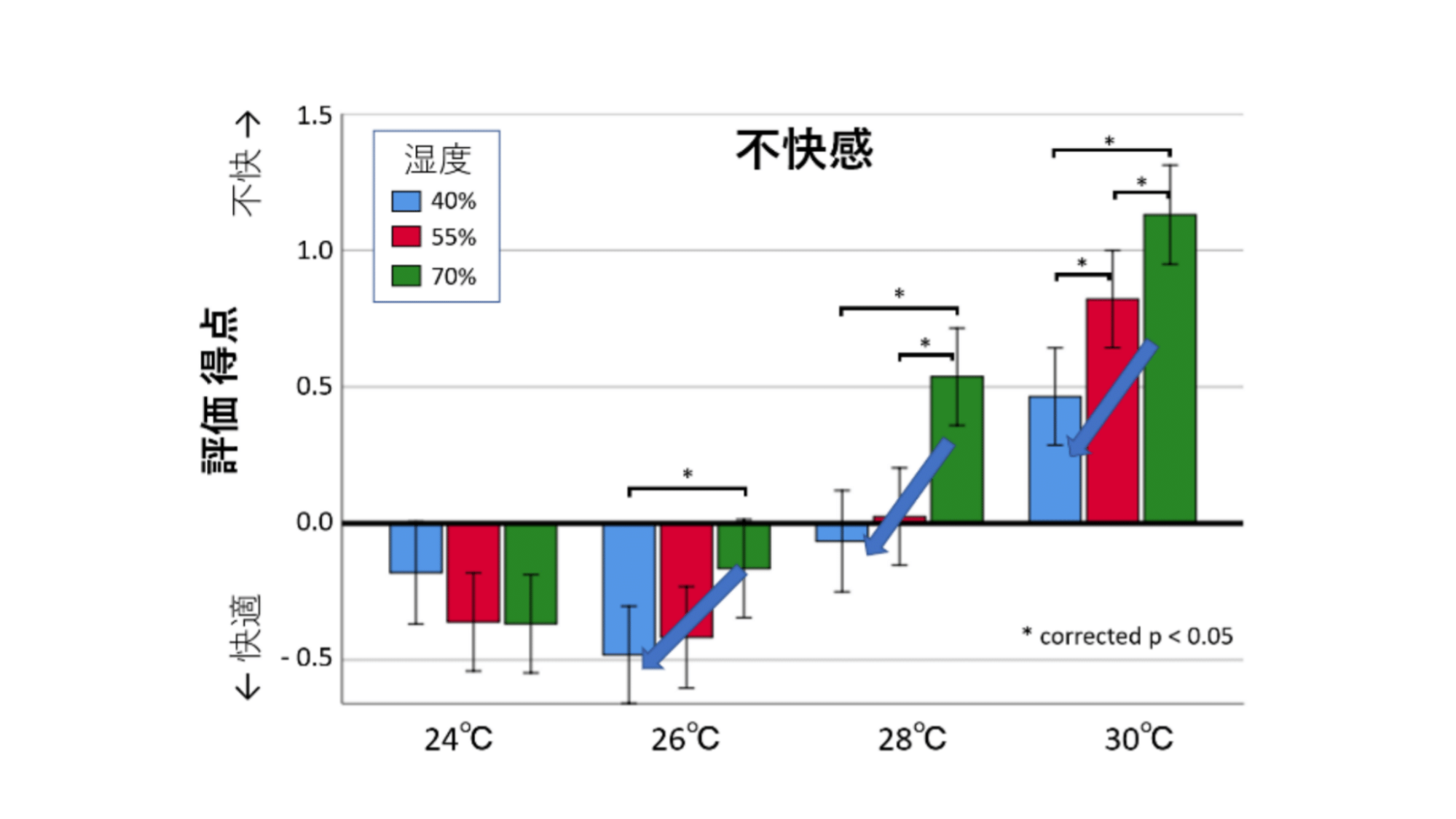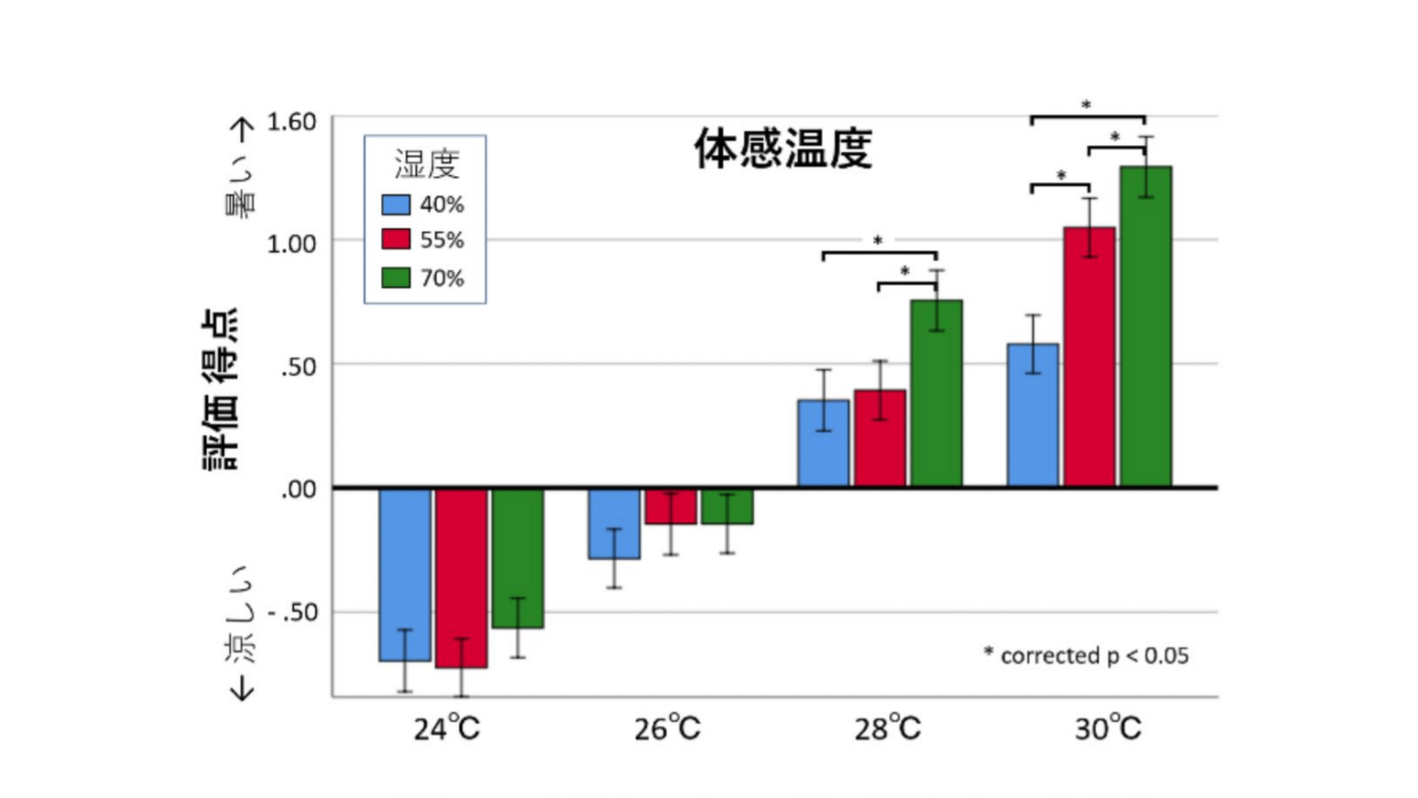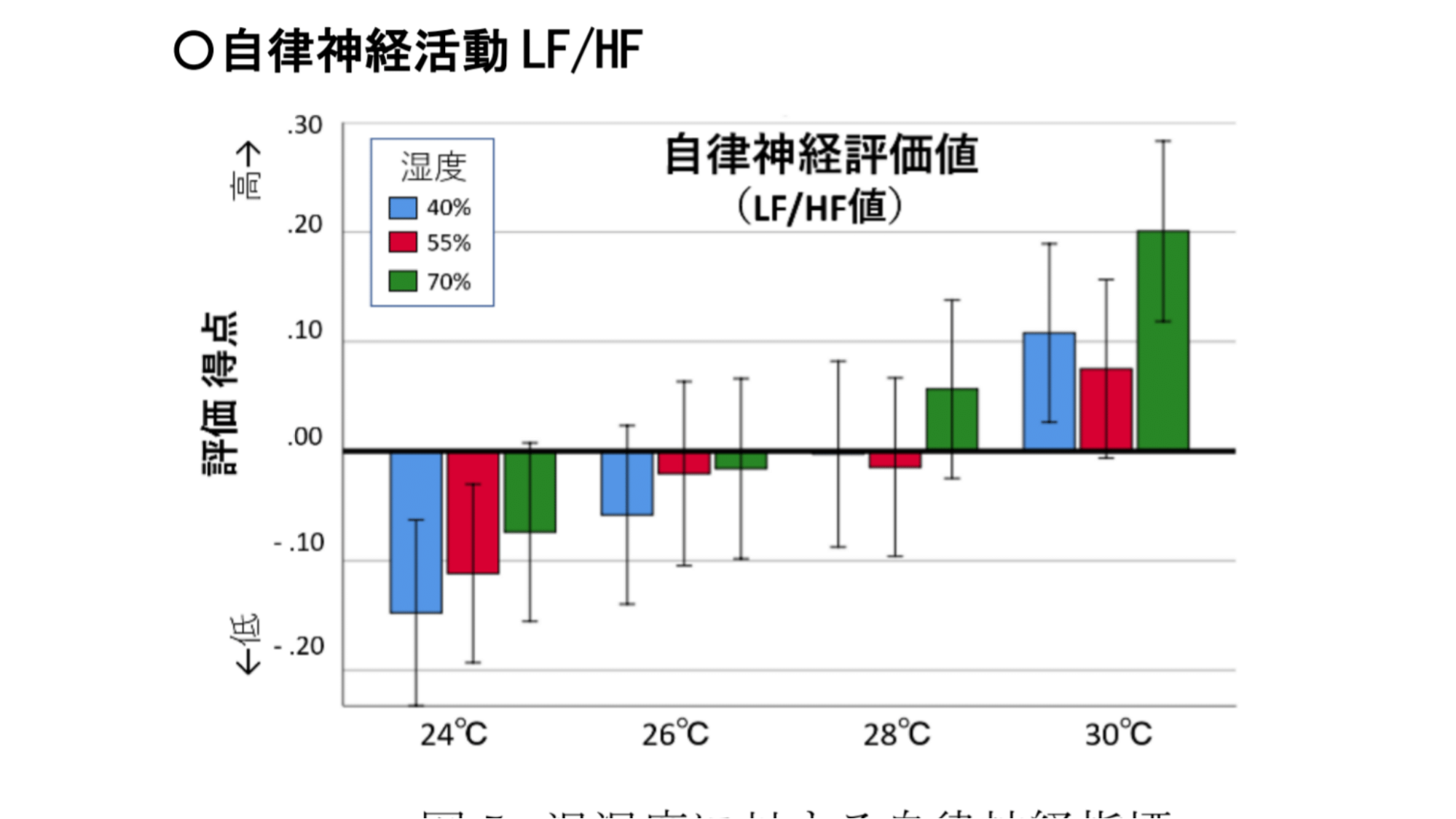 この結果は、こちらの研究結果から導き出されました。 この研究では「体感、不快感、疲労感」の3つの項目でアンケートを取り、加えて自律神経評価値を測定しています。 「体感、不快感、疲労感」はあくまで回答者の主観ですが、自律神経評価値は身体的生理現象に関するデータです。 そのため「温度は27-28度、湿度は45~55%」が体感的にも身体的にも快適な温度・湿度だといえるでしょう。