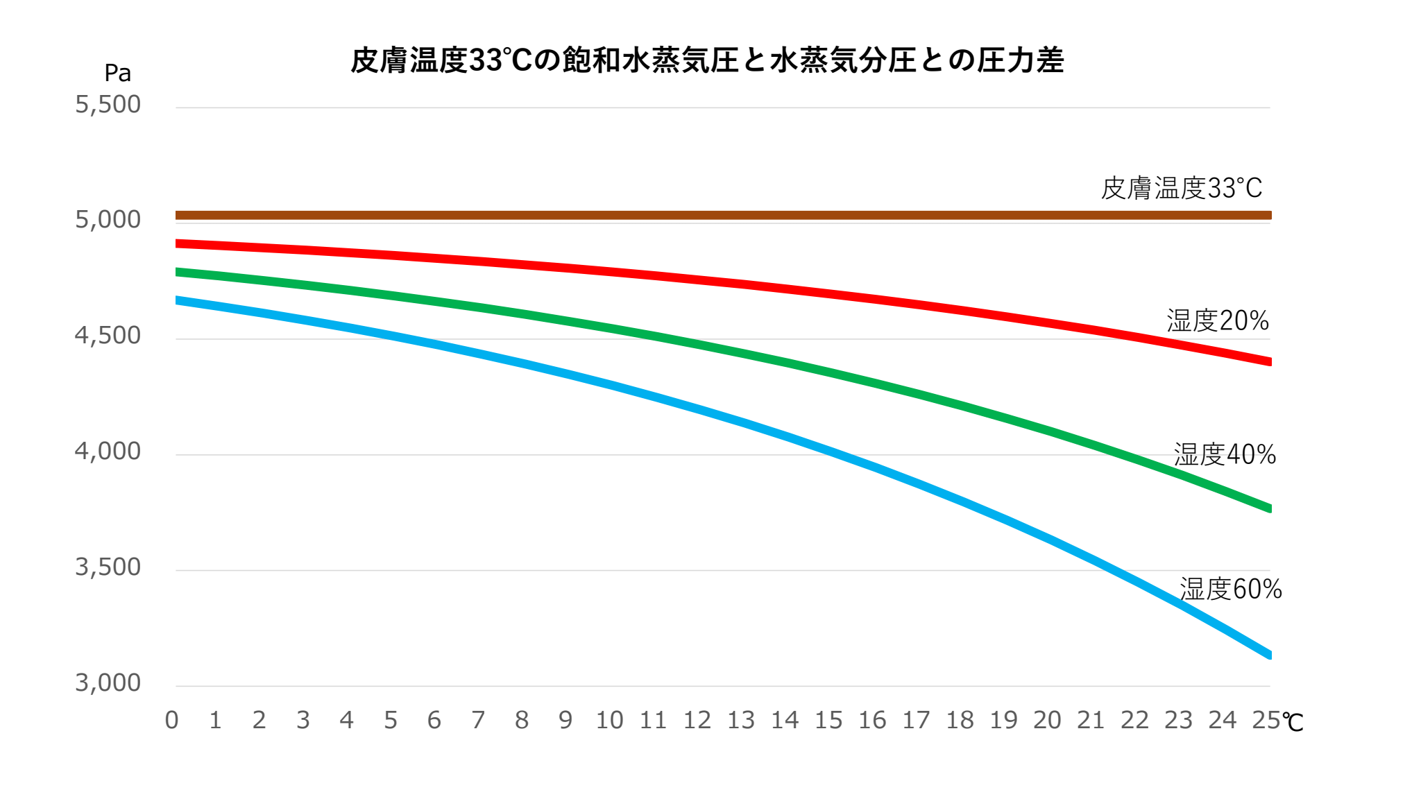 そのため、このグラフから、 ・「温度と湿度が上がるほど、乾燥しにくくなる」 →皮膚の表面温度と、空気温度の差が小さくなり、皮膚から水分が抜けにくくなるため