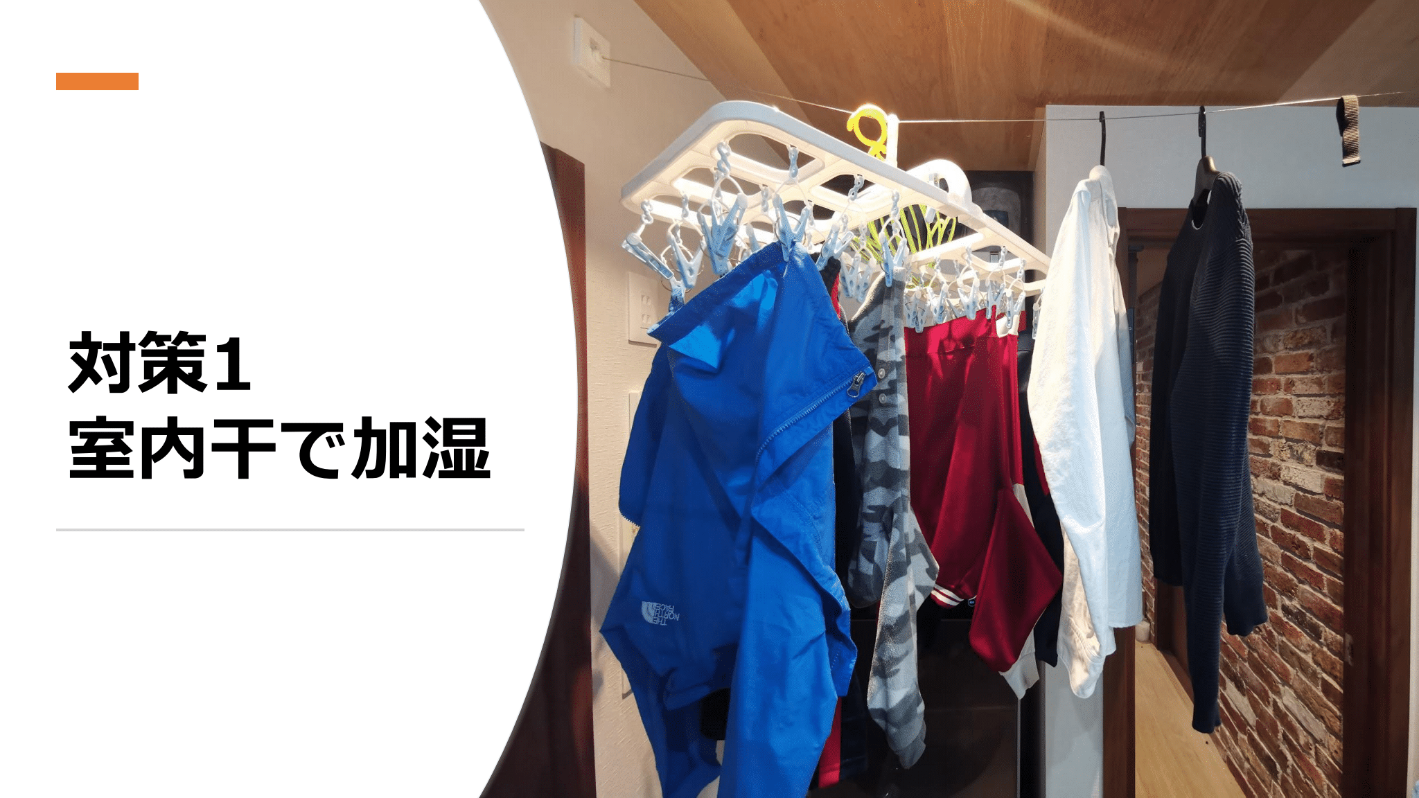 乾燥対策の1つ目は、「室内干しで加湿」です。