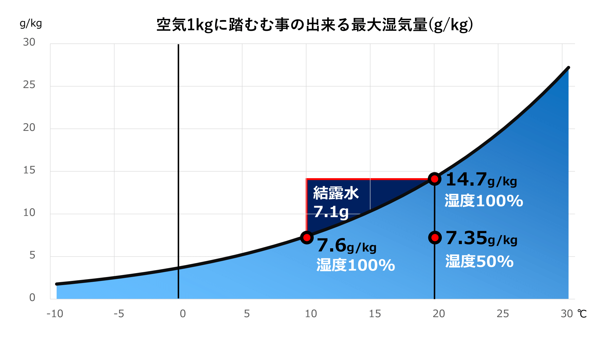 こちらは、「空気1kgに含むことの出来る最大の水蒸気量」についての図です。 弧を描いている黒い太線が、境界線です。 そのため、この線より水蒸気が多い場合は、空気はそれ以上水蒸気を含むことができず、「結露」します。