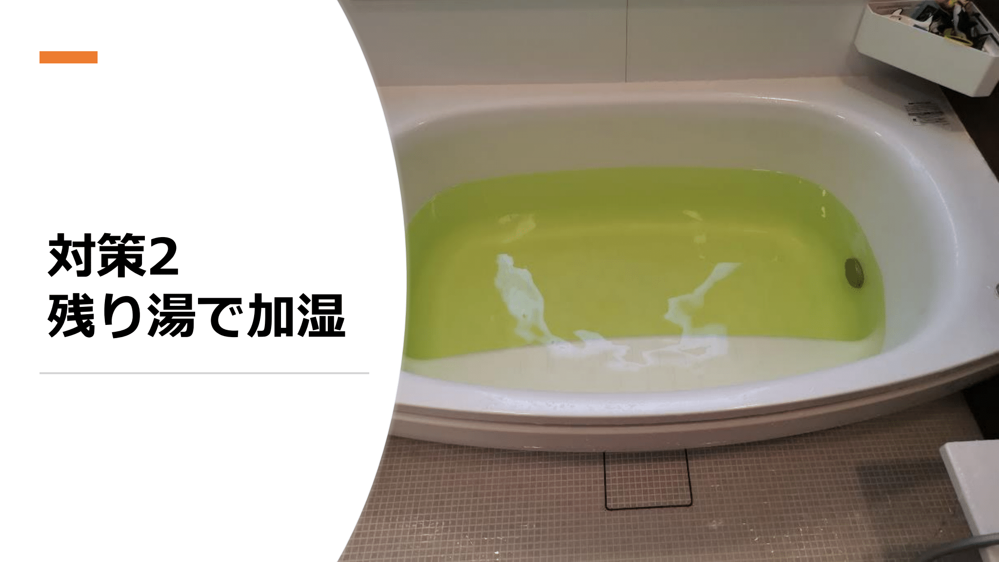 乾燥対策の2つ目は、「残り湯で加湿」です。 浴槽のお湯を貯めておき、浴槽のフタやお風呂場の扉を開けておくことで、水分が蒸発し、約2.7Lの加湿ができます! (場合にもよりますが)