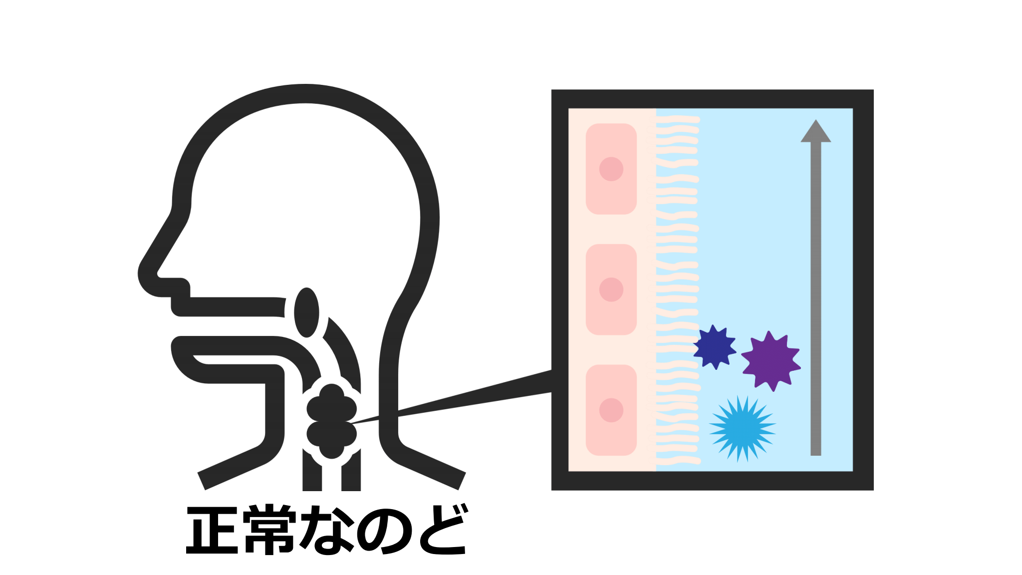 こちらは、「正常なのど」の図です。 正常なのどでは、繊毛運動によって、病原体やアレルギー物質を身体の外に押し出します。 その結果、身体への被害を最小化してくれます。