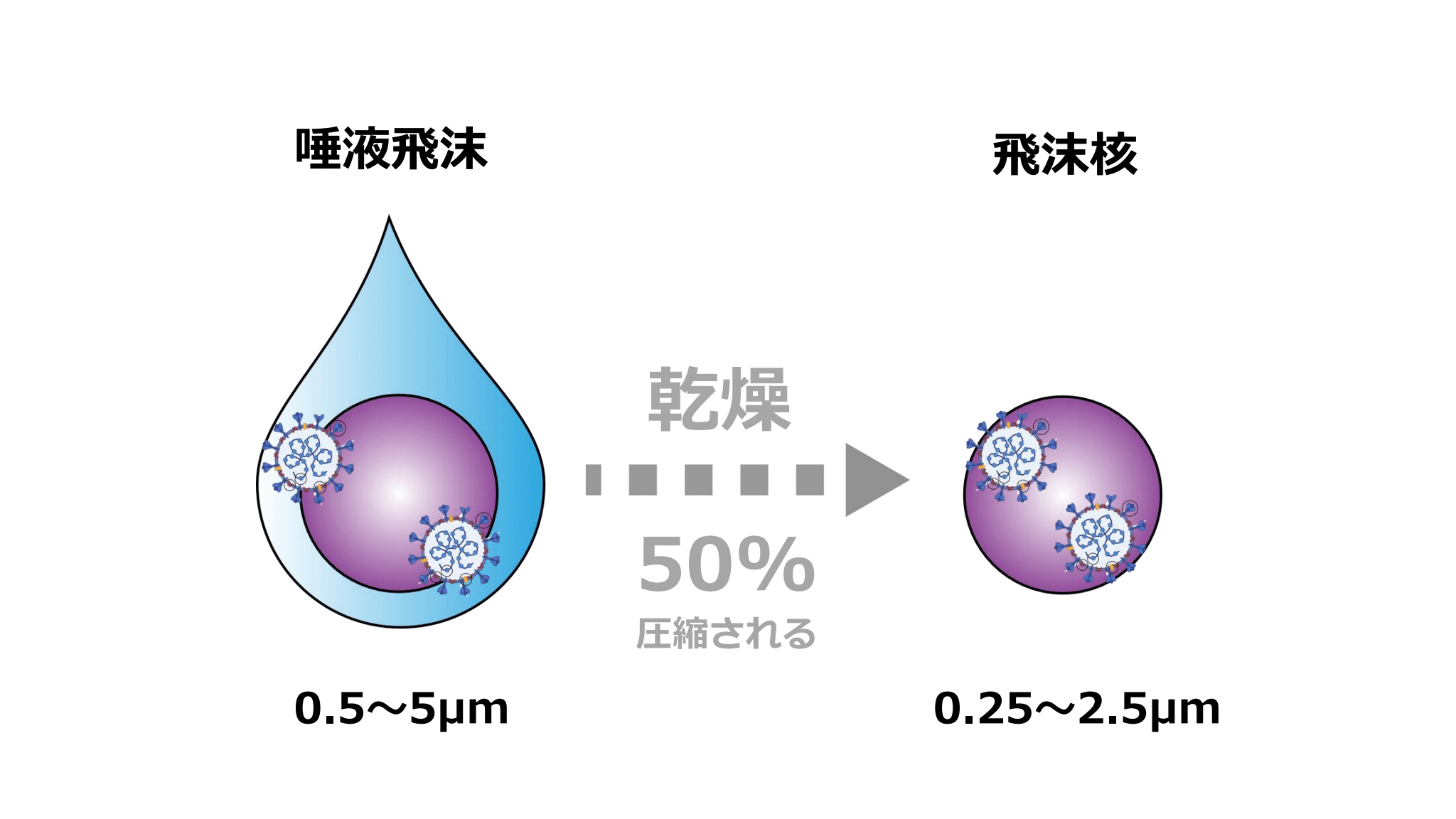しかし、冬になって乾燥すると、唾液の飛沫が飛んだ瞬間に乾燥して、サイズが小さく、そして軽くなります。(上図参照) そうなると、地面に落ちずに、ウイルスが空気中に漂い続けてしまう・・・。
