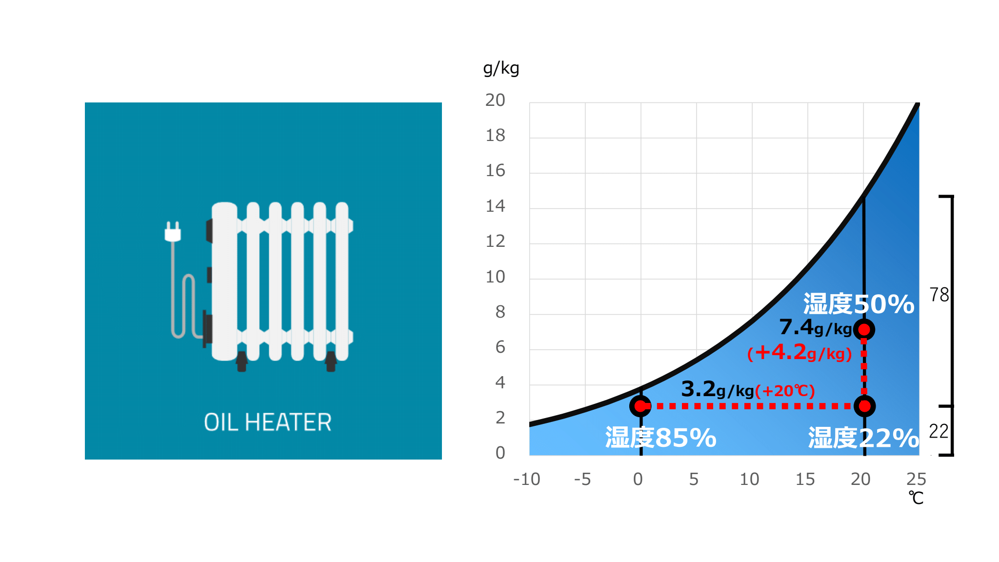 例えば、外気の温度が0°C、湿度が85%の時に、家の中を20°Cまでストーブで暖めたとしましょう。 20°Cの時、空気中に含むことができる最大の水蒸気量(飽和水蒸気量)は、14.7g/kgです。 しかし、外気(湿度85%、上図参照)には3.2g/kgの水蒸気しか含まれていません。 そのため、相対湿度が22%まで低下してしまい、とても乾燥してしまいます。