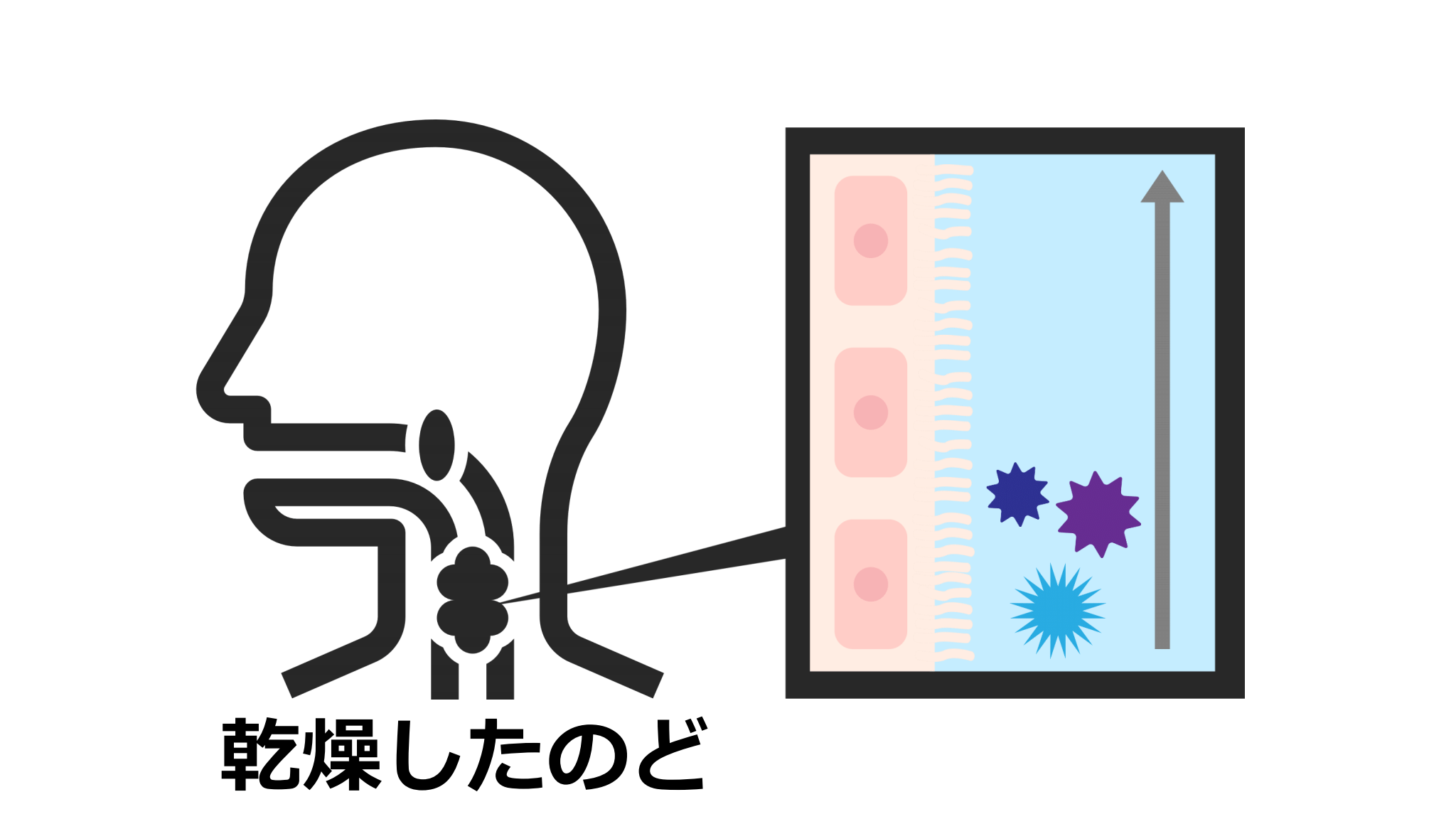 こちらは「乾燥したのど」の図です。 乾燥したのどは、繊毛運動のパワーが低下し、病原体やアレルギー物質が身体の奥まで入ってしまいます。 そのため、冬にはインフルエンザが流行する傾向にあります。 また、新型コロナウイルスも重症化するリスクが高いのではないか、と推察しています。 (新型コロナは変異しているため、一概には言えませんが)