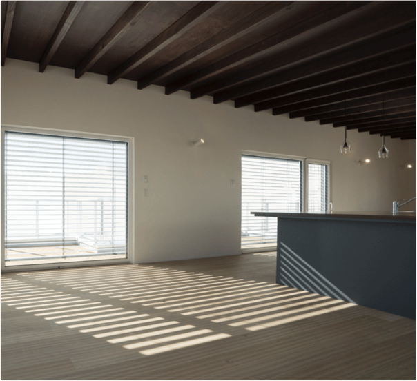 Wellnest Homeの住宅の南側壁面には外付けブラインドが設置されることが標準仕様となっています。ちょうど正午の撮影でしたのでブラインド影が光と共にストライプ状になった様子がとても印象的な写真です。第4章ではキッチン空間における付加価値の話をしましょう。このカウンターは90cmと通常より広い奥行きとなっています。この奥行きがこれからのキッチンにとって付加価値を与えることになります。