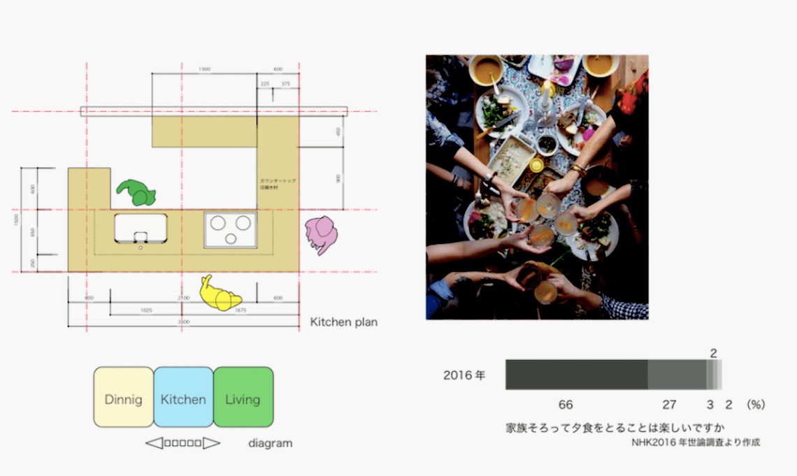 右の図は「家族が揃って夕食をとることは楽しいですか」との質問に対するNHK統計調査のグラフです。66%の人がそう思うと答え、27%の人がどちらかといえばそう思うと答えました。3%から右側はそうは思わない回答分類ですので、ほとんどの割合で楽しいと感じているのが分かります。このことからも住宅にとってキッチンやダイニングのように食に関係する空間はこれからも中心的な役割を求められていくと思います。