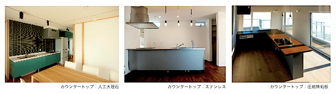 写真はいろいろなカンタートップの素材の例です。右の圧縮木材は無垢材に高圧力をかけて圧縮した木板を使っているため耐久性のある材料です。木製でも水廻りに十分使用できインテリアとしてもマッチする素材でもあります。左の写真はアクセントカラーとしてエメラルドグリーンを扉面材に施した例です。カウンタートップは印象が強くなり過ぎないために人工大理石の白をコーディネートしました。このように自分好みのカラーをポイントとして選択するのもキッチンデザインならではのノウハウです。