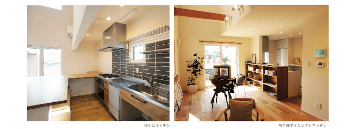 左の写真はダイニングテーブルとキッチンがU字型に連続して配置された例です。ダイニングテーブルは家族全員で使うワークトップに早変わりです。右の写真は煩雑になりがちなキッチンの手元を家具で上手に隠しながらも、ダイニング空間とは柔らかな関係でつなぎ家族とのコミュニケーションを計れるように配慮しています。