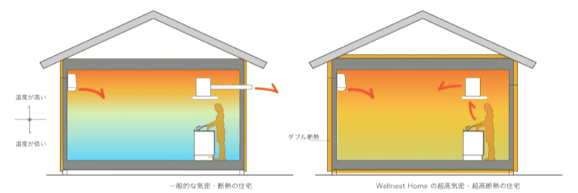 2階と1階との差でも室内温度差を2℃以内に抑えます。外皮性能が良ければキッチンはただの作業する場から快適でみんながあつまる空間になるのです。またキッチンのレンジフードですが、通常の機器であれば相当な量の暖房で暖めた空気を排気と一緒にそのまま捨てていることになります。さらに暖かい空気は上部に溜まりますので図のように空調から出た熱をそのまま捨てていると言っても過言ではありません。
