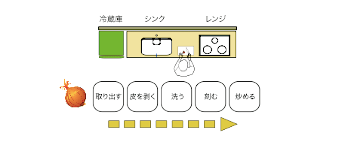 上のイラストは玉ねぎを炒める料理の動作を図にしたものです。冷蔵庫から玉ねぎを取り出して、下拵えをして、洗って、刻んで、炒めています。この一連の流れは冷蔵庫/シンク/レンジの位置関係と連動したみなさんお料理の基本となっていると思いますが、料理の種類や自分の好みの動きなど実に料理の動作は様々です。ぜひ一度「自分流」の料理の動きを振り返ってショールームなどでキッチンの前に実際に立って確かめて見てください。