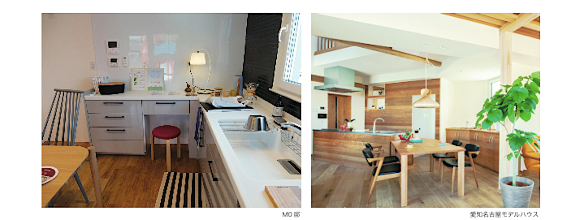 ダイニングテーブルとキッチンの配置もぜひご自分の使いやすい形を設計者と共に相談しながら決めてください。ダイニングテーブルをキッチンスペースの中央に配置しました。こどもが小さい間は宿題をダイニングテーブルですることが多いようです。宿題の手助けをしながらいっしょの時間をこの便利なキッチンスペースで過ごす事ができます。また右の愛知名古屋モデルハウスはテーブルがキッチンカウンターを連続していて、料理をサーブするのにともて便利になっています。