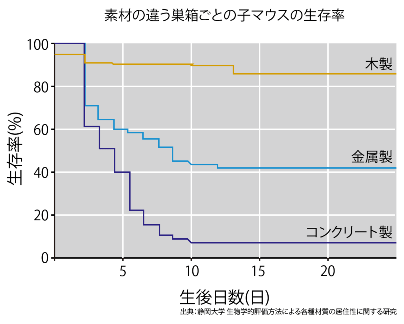 静岡大学農学部の研究発表*1)によると「木製」「金属製」「コンクリート製」の三種類の巣箱を作成し、ネズミの母子を飼育し、その行動と発育を調査したレポートがあります。それぞれの巣箱では母ネズミの行動に違いがみられ、木製巣箱がもっとも授乳時間が長く、金属、コンクリートの巣箱では木製と比較して授乳時間が短いことが多く、子ネズミの体重は木製が最も大きく、金属、コンクリート製は小さい傾向がみられています。最も差が出たのは、子ネズミの生存率であり、木製の巣箱では85%が生存していたのに対して、金属製では40%、コンクリート製に至ってはわずか10%と非常に大きな差となったことが報告されています。このような大きな差を及ぼした要因としては、建材の材質による熱の奪われ方の違いではないかと考えられています。