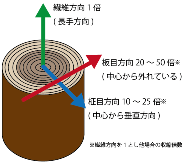 板目方向(20~50倍) > 柾目方向(10~25倍) > 繊維方向(1倍)
