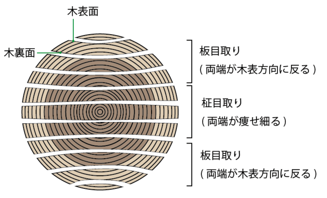 ただし、丸太の中心部を通っている一部のみしか柾目にならないので、1つの丸太から取れる柾目の木材は板目のものよりも少なく、価格が高くなります。